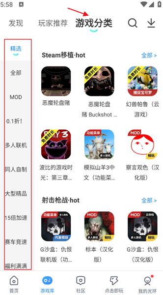 2、點擊【游戲庫】在游戲分類中給大家將游戲詳細分成了超多種類,各種多人聯(lián)機/同人自制/大型精品等等;