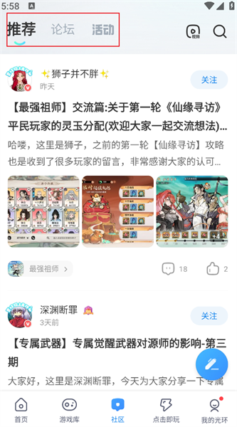 3、在【社區(qū)】板塊中,有超多網(wǎng)友在線分享交流自己玩游戲的感想,玩家可以點贊評論,和大家一起互動;