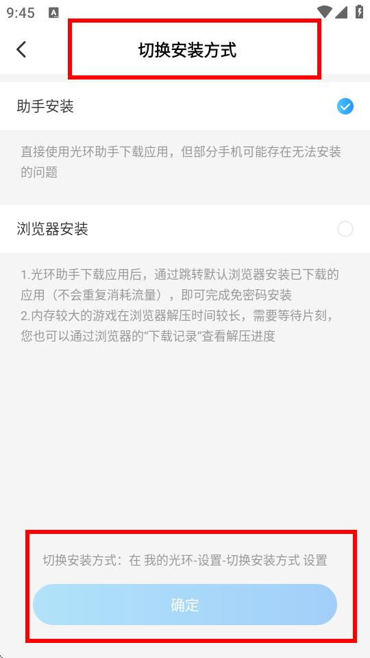 3、在切換安裝方式界面,根據(jù)需求選擇助手安裝或瀏覽器安裝,選擇后點擊確定保存設置。