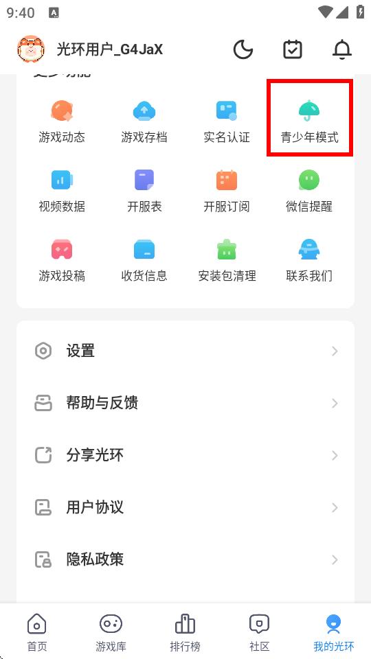 2、在個(gè)人頁(yè)面中找到青少年模式選項(xiàng)并點(diǎn)擊進(jìn)入。