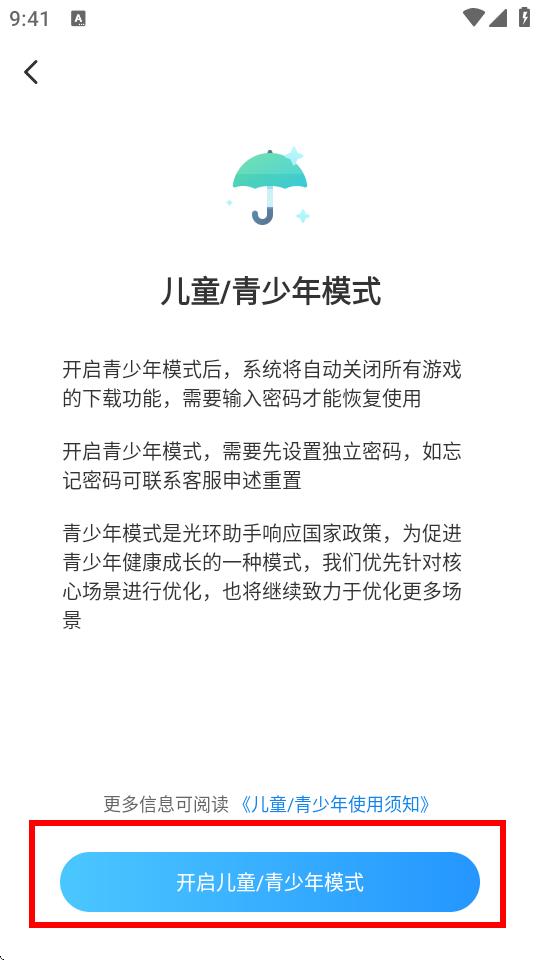 3、進(jìn)入青少年模式頁(yè)面后,點(diǎn)擊下方開(kāi)啟兒童/青少年模式按鈕,按照提示設(shè)置密碼即可開(kāi)啟。
