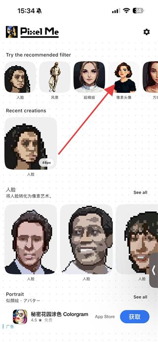 1、打開PixelMe應(yīng)用,點(diǎn)擊像素頭像濾鏡選項(xiàng)。