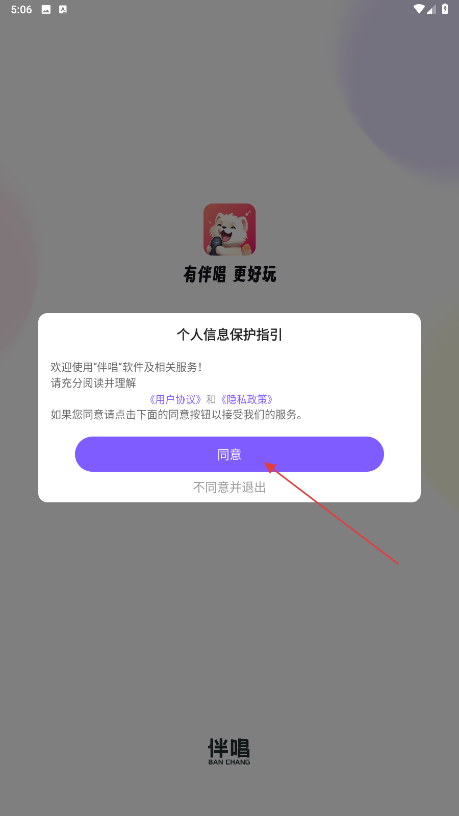 1、打開伴唱APP,進入時彈出個人信息保護指引,點擊同意的按鈕。
