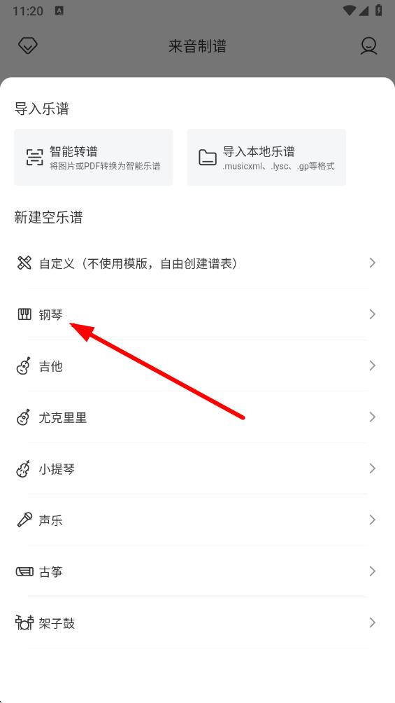 2、在創(chuàng)建樂譜選擇界面的新建空樂譜板塊中,點擊鋼琴選項。