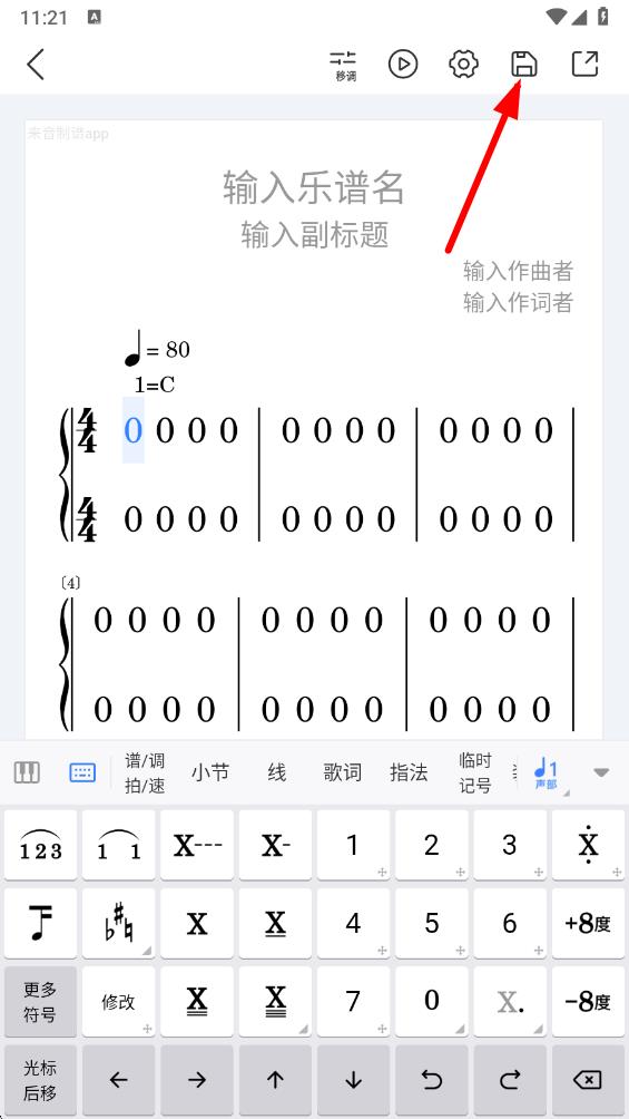 4、進入樂譜編輯頁面,在下方符號欄選擇相應音符、節(jié)拍等符號進行輸入編輯,完成后點擊界面右上角的保存按鈕即可完成鋼琴譜制作。