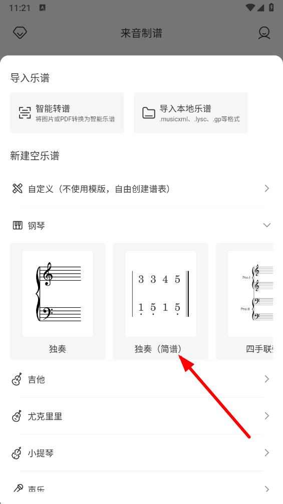 3、展開鋼琴類別后,選擇你需要的譜式,比如獨奏簡譜。