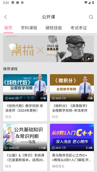 3、在公開課中有學(xué)科課程、硬核技能、考試考證三個分類