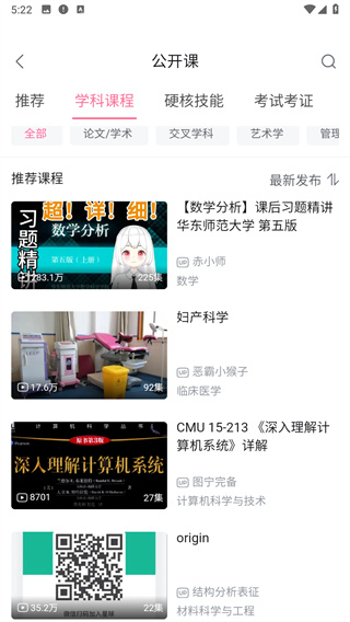 4、通過學(xué)科課程還能詳細看到論文/學(xué)術(shù)、交叉學(xué)科、藝術(shù)學(xué)等不同的課堂分類