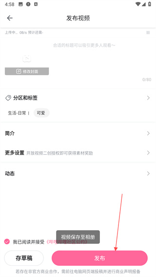 4、您可以將編輯好的視頻直接存為草稿或者發(fā)布到嗶哩嗶哩