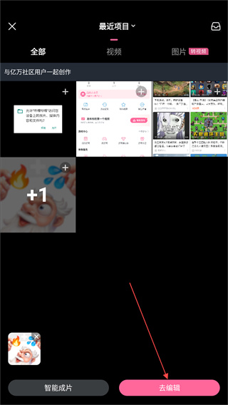3、選擇要投稿的視頻或者圖片,點擊去編輯