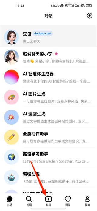 1、通過本站安裝豆包app,在主界面點擊底部的【創(chuàng)建】按鈕;