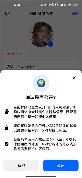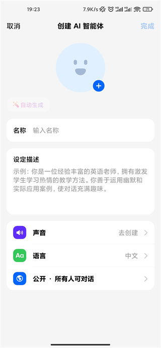 2、在打開的創(chuàng)建界面中選擇頭像、輸入名稱、描述,選擇語言、聲音等,同時設置公開屬性;