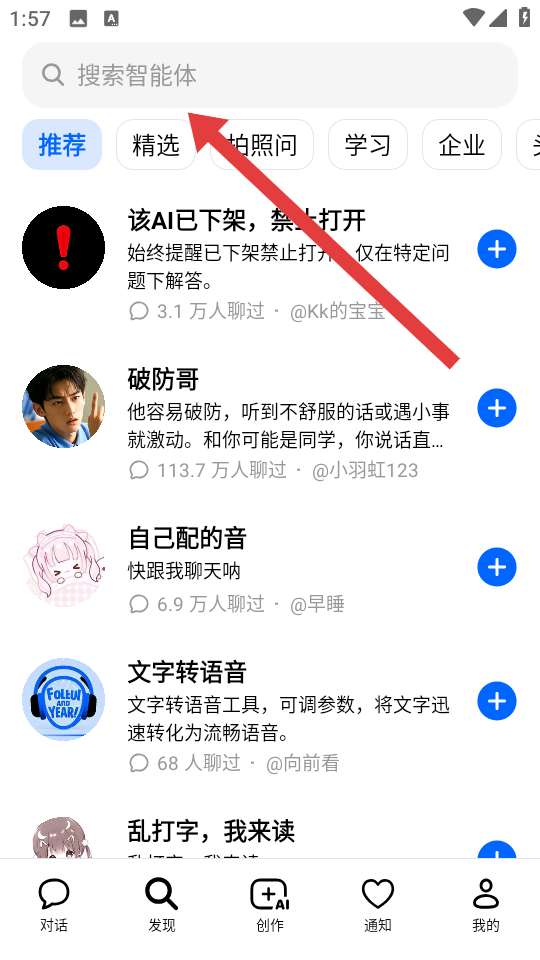 1、進入豆包發(fā)現(xiàn)的頁面后,點擊頂部搜索智能體的輸入框,為搜索圖片生成類智能體做準備。