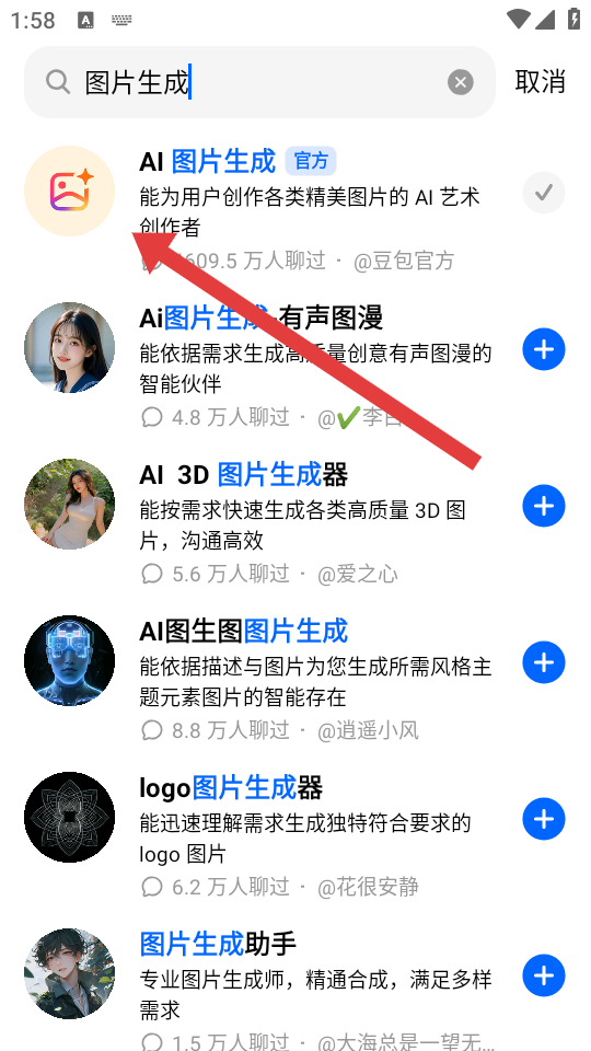 2、在搜索框中輸入圖片生成,選擇官方的AI圖片生成智能體,進入圖片生成操作界面。