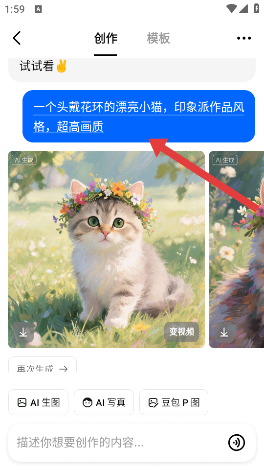 3、在創(chuàng)作界面的輸入框里,需要輸入想要生成圖片的描述,即可生成對應的圖片。