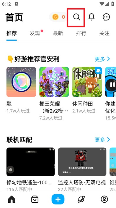 1、打開最新版的創(chuàng)游世界app,然后在首頁點(diǎn)擊上方的【搜索放大鏡】去進(jìn)行搜索;