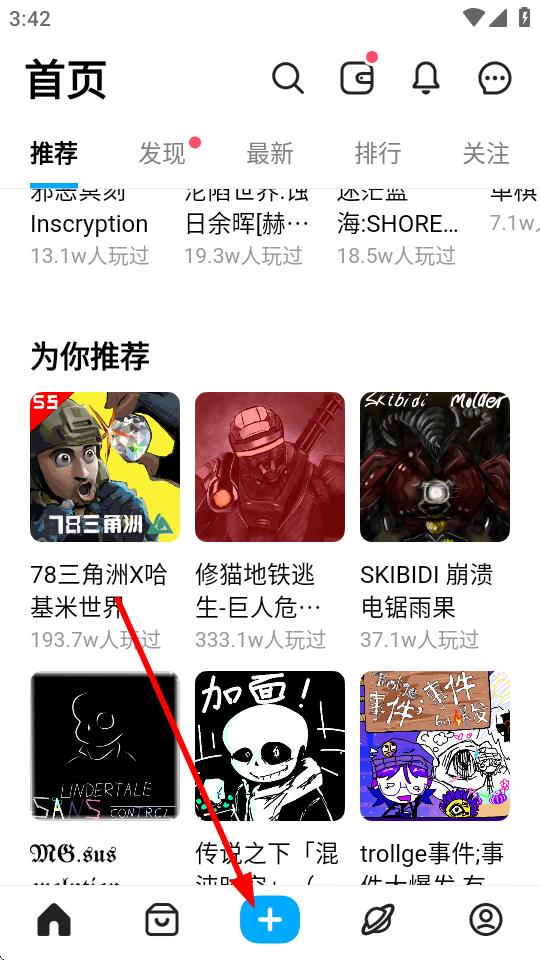 1、打開創(chuàng)游編輯器App,在首頁點(diǎn)擊底部中間的加號按鈕。