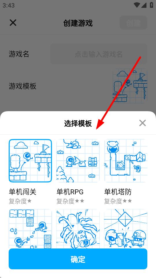 4、點(diǎn)擊游戲模板選項,選擇合適的游戲模板,完成游戲內(nèi)容編輯后,點(diǎn)擊頁面右上方的創(chuàng)建按鈕,按提示完成發(fā)布操作。