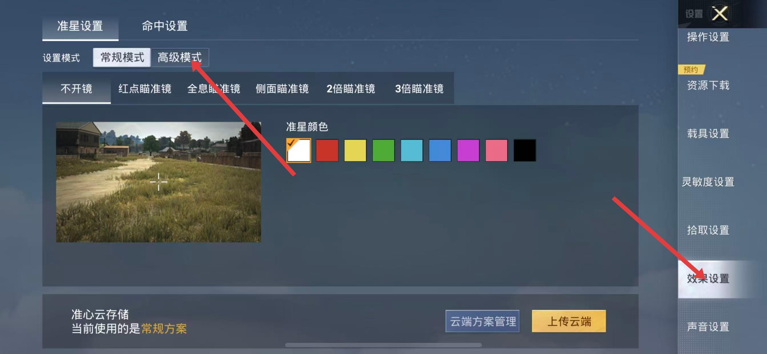 2、在設(shè)置界面中,點(diǎn)擊右側(cè)列表中的效果設(shè)置,選擇高級(jí)模式。