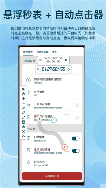 屏幕懸浮秒表app是一款非常好用的多功能懸浮時(shí)鐘工具,這款軟件能夠在手機(jī)屏幕上懸浮顯示一個(gè)方便操作的秒表,以便你能夠隨時(shí)啟動(dòng)和停止計(jì)時(shí),同時(shí)app還支持計(jì)圈功能,能夠記錄多個(gè)計(jì)時(shí)周期,非常適合多種需要計(jì)時(shí)的場(chǎng)合。