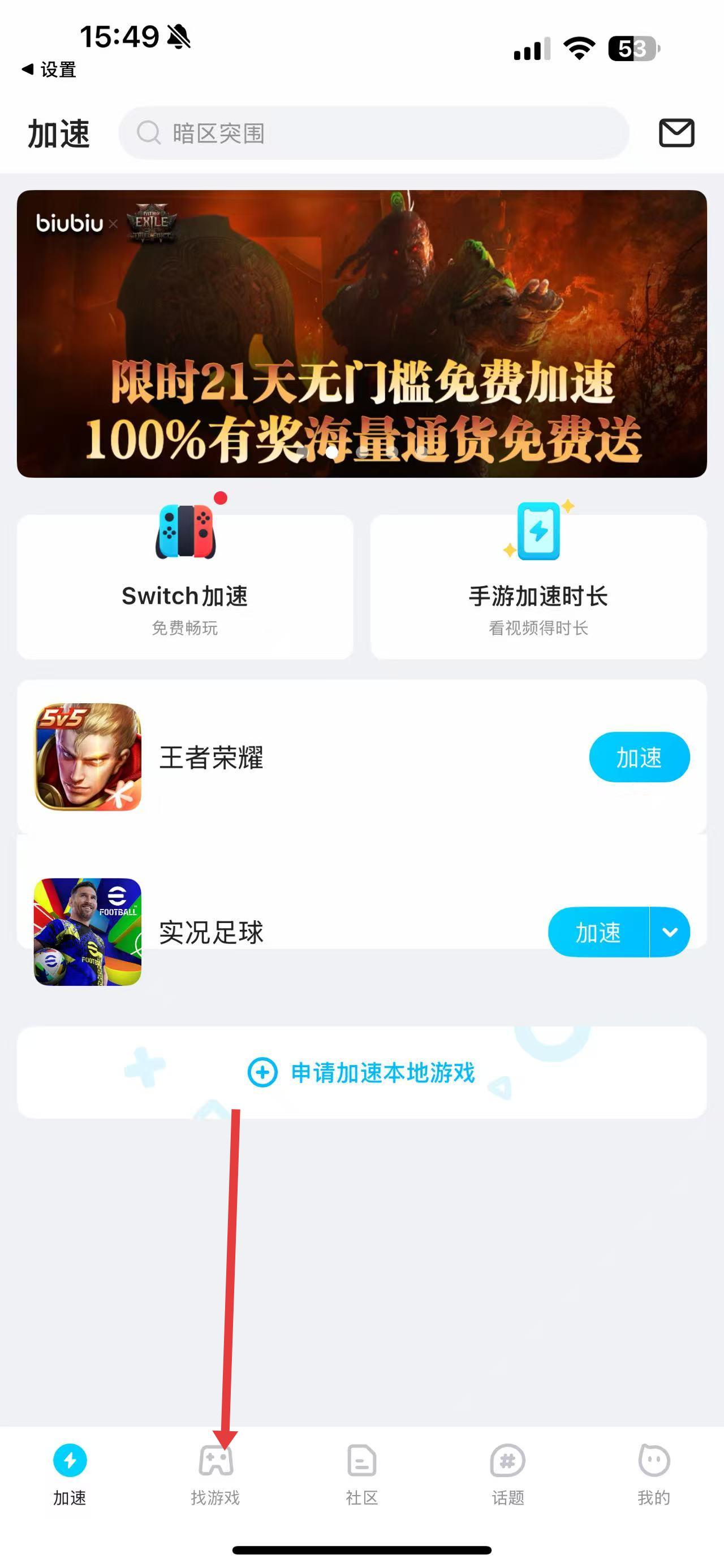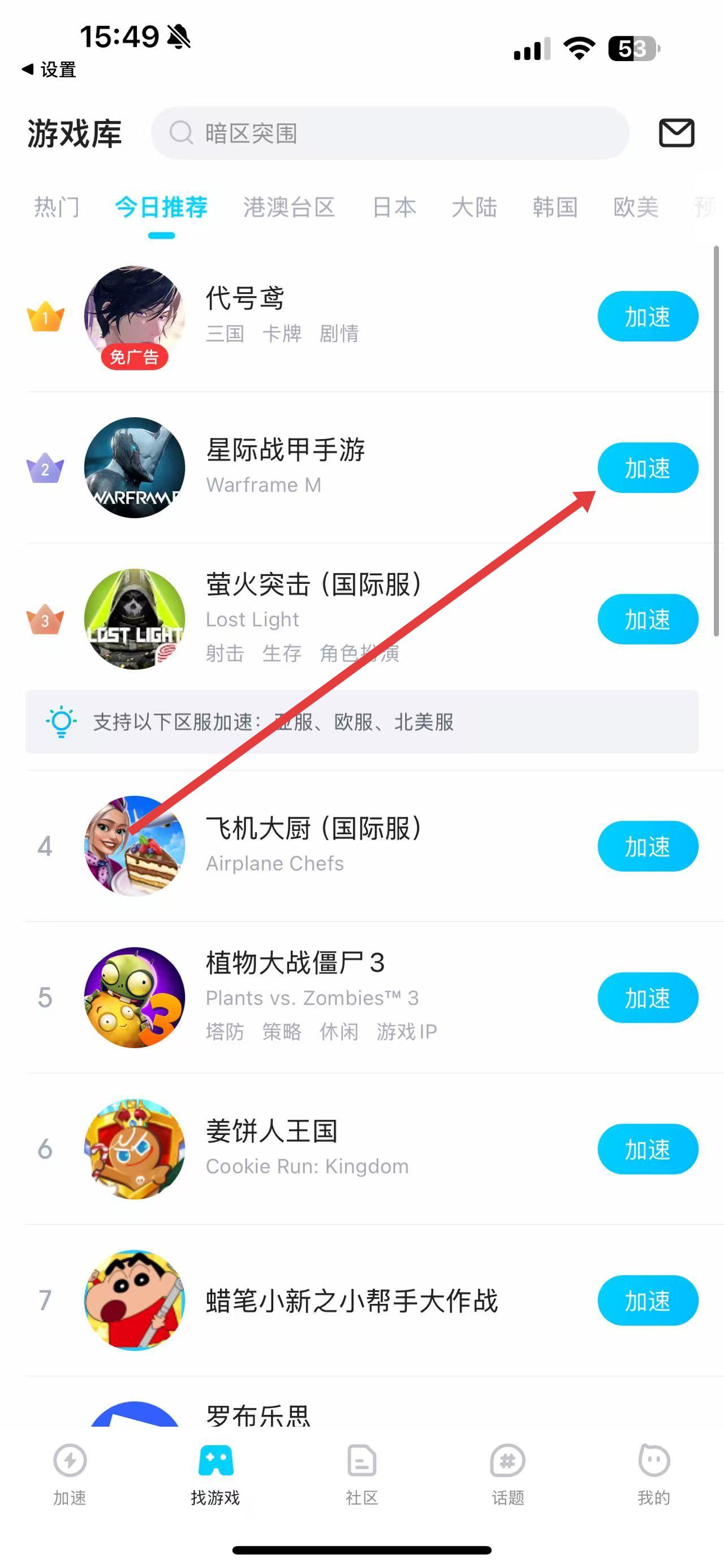 2、在游戲庫(kù)中,選擇任意一款游戲,點(diǎn)擊其右側(cè)的加速按鈕,觸發(fā)實(shí)名認(rèn)證提示若未觸發(fā),可查看是否有其他入口引導(dǎo)實(shí)名認(rèn)證。