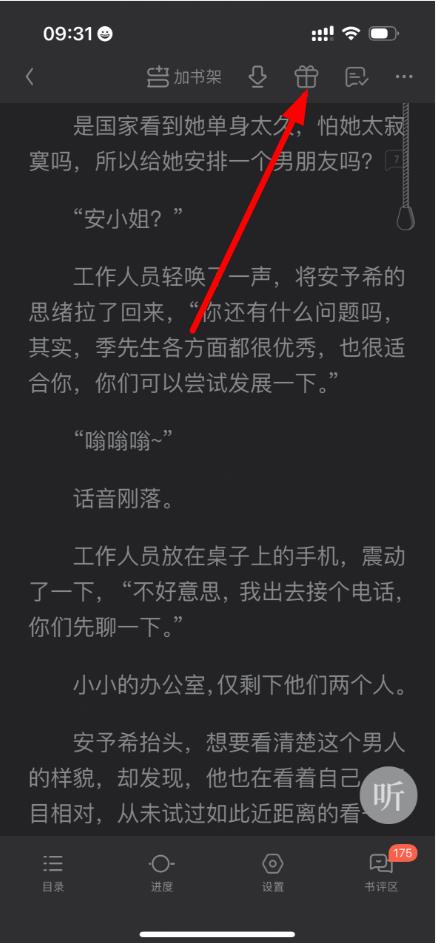 2、在小說閱讀界面點(diǎn)擊上方功能區(qū),找到并點(diǎn)擊類似“禮物”圖標(biāo)進(jìn)入打賞或贈禮界面。