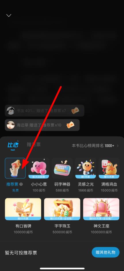 3、在打賞界面中找到月票相關(guān)圖標(biāo)如帶有月票標(biāo)識的禮物,若有可投月票,點(diǎn)擊對應(yīng)圖標(biāo),按提示完成投月票操作。