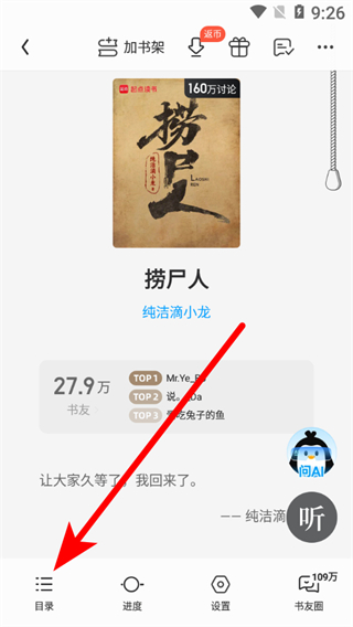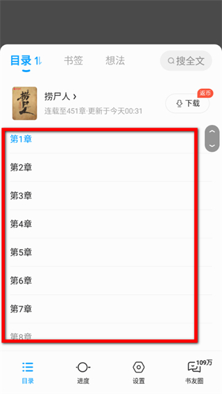 3、在書籍閱讀頁面,點(diǎn)擊目錄選項,進(jìn)入目錄展示頁面。