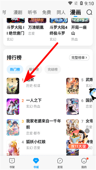 2、在漫畫頻道,選擇排行榜中的漫畫作品,進(jìn)入作品詳情頁。