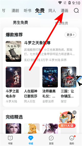 1、在QQ閱讀書城頁面,點(diǎn)擊漫畫選項,進(jìn)入漫畫頻道。