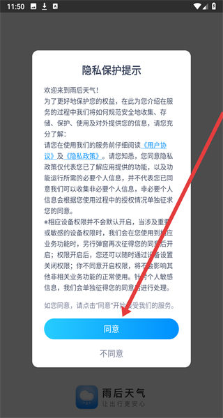1、在雨后天氣的“隱私保護(hù)提示”彈窗點(diǎn)擊“同意”,進(jìn)入福州市天氣主界面。