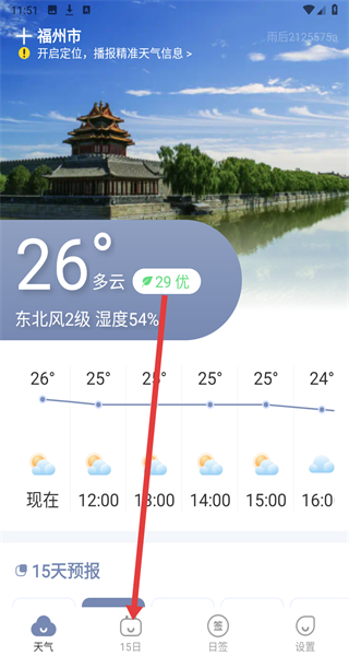 2、在福州市天氣主界面點(diǎn)擊底部“15日”,進(jìn)入15日預(yù)報頁面。
