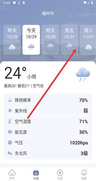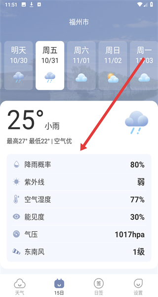 3、在15日預(yù)報頁面點(diǎn)擊“周五10/31”,切換到10月31日天氣界面。