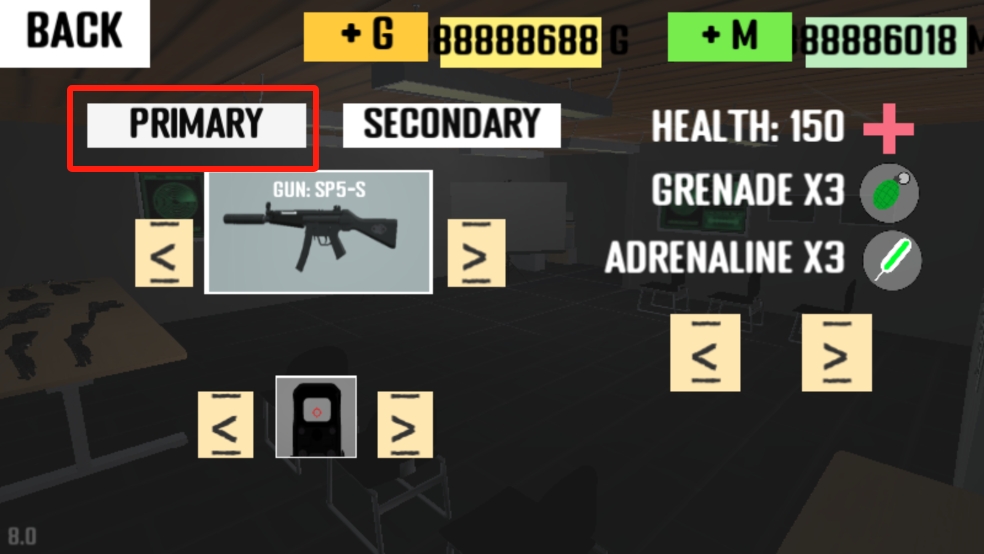 3、這個是手槍界面是副武器,在戰(zhàn)斗上也許沒有這里厲害但是不能沒有,所以選擇合適自己的作戰(zhàn)工具吧;