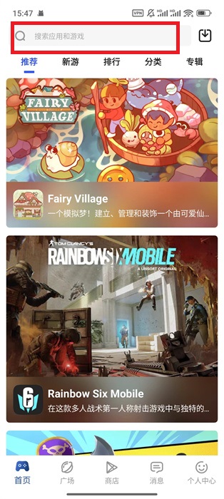 1、打開軟件就可以在首頁界面去進(jìn)行搜索游戲,點(diǎn)擊上方的搜索框,進(jìn)行搜索;
