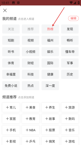 2、點擊進入后,在我的頻道里快速找到熱榜新聞頻道,點擊熱榜頻道進行添加。