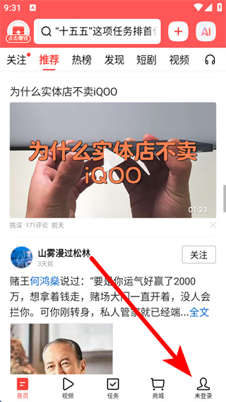 1、打開今日頭條APP,點擊底部導(dǎo)航欄的未登錄,進入個人頁面。