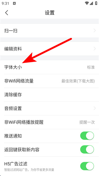 3、在設(shè)置界面中,點擊字體大小選項,進入字體大小預(yù)覽頁面。