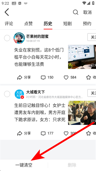 4、進入編輯模式后,點擊底部一鍵清空,即可刪除歷史記錄。