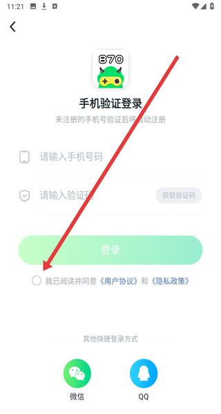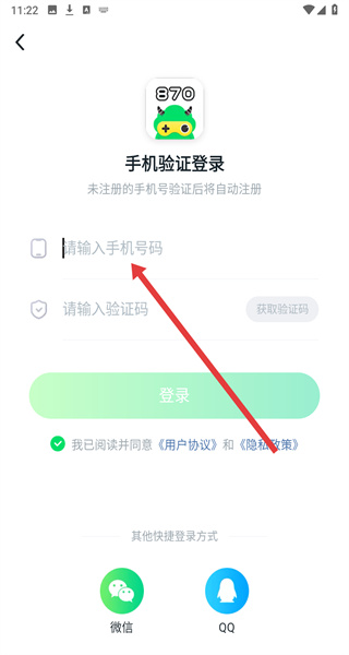 4、勾選好同意按鈕后,可以在上方輸入框中填寫手機號碼,在獲取驗證碼后填寫即可完成登錄。