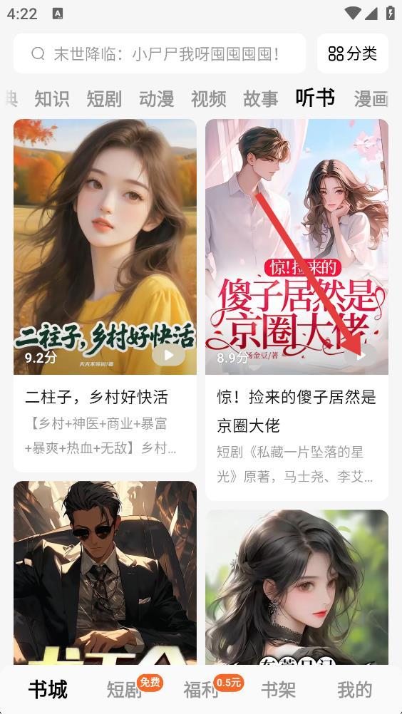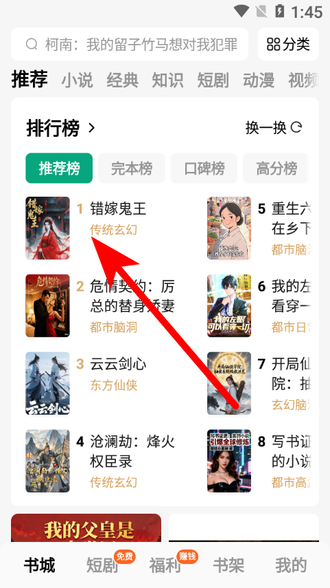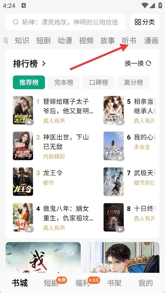 2、可瀏覽推薦榜、完本榜等榜單,或直接搜索想聽(tīng)的小說(shuō),點(diǎn)擊對(duì)應(yīng)小說(shuō)封面,進(jìn)入小說(shuō)聽(tīng)書(shū)詳情頁(yè)。