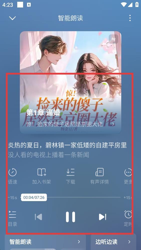 3、進(jìn)入小說(shuō)聽(tīng)書(shū)界面后,點(diǎn)擊播放按鈕開(kāi)始收聽(tīng),還能在該界面調(diào)節(jié)語(yǔ)速、加入書(shū)架、設(shè)置定時(shí)關(guān)閉等。