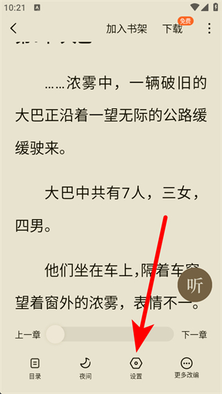 2、在小說(shuō)內(nèi)容界面,點(diǎn)擊下方設(shè)置選項(xiàng),進(jìn)入設(shè)置頁(yè)面。