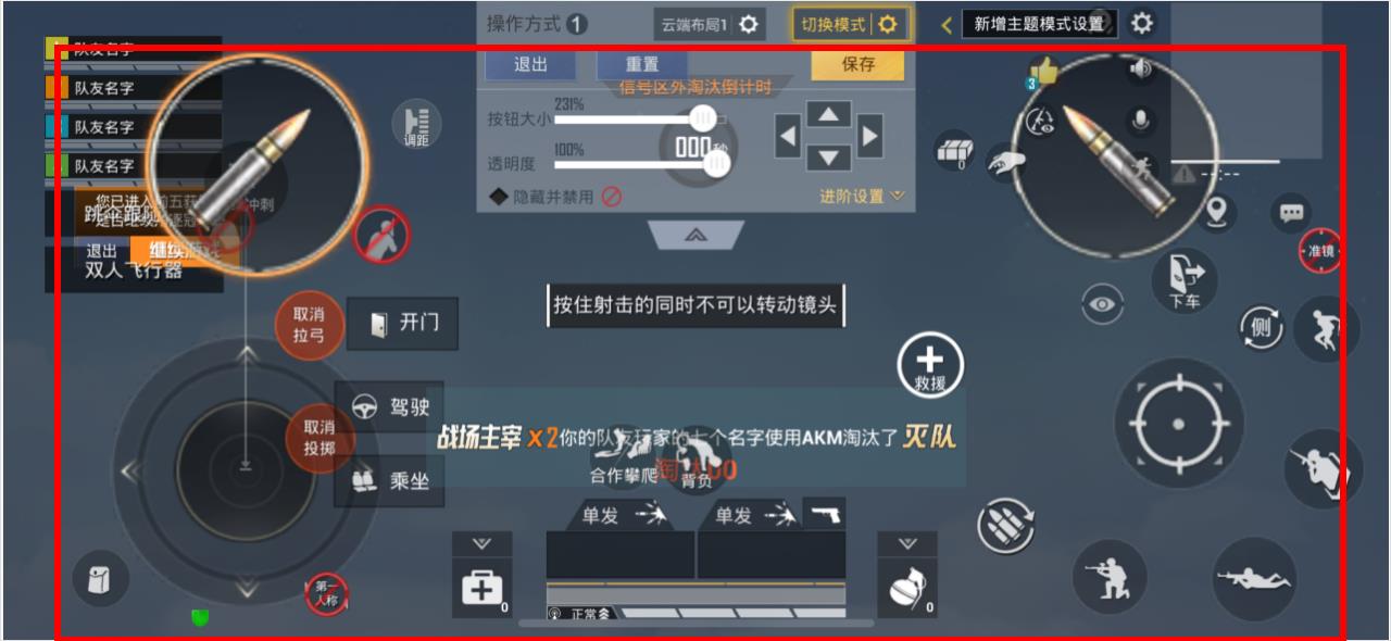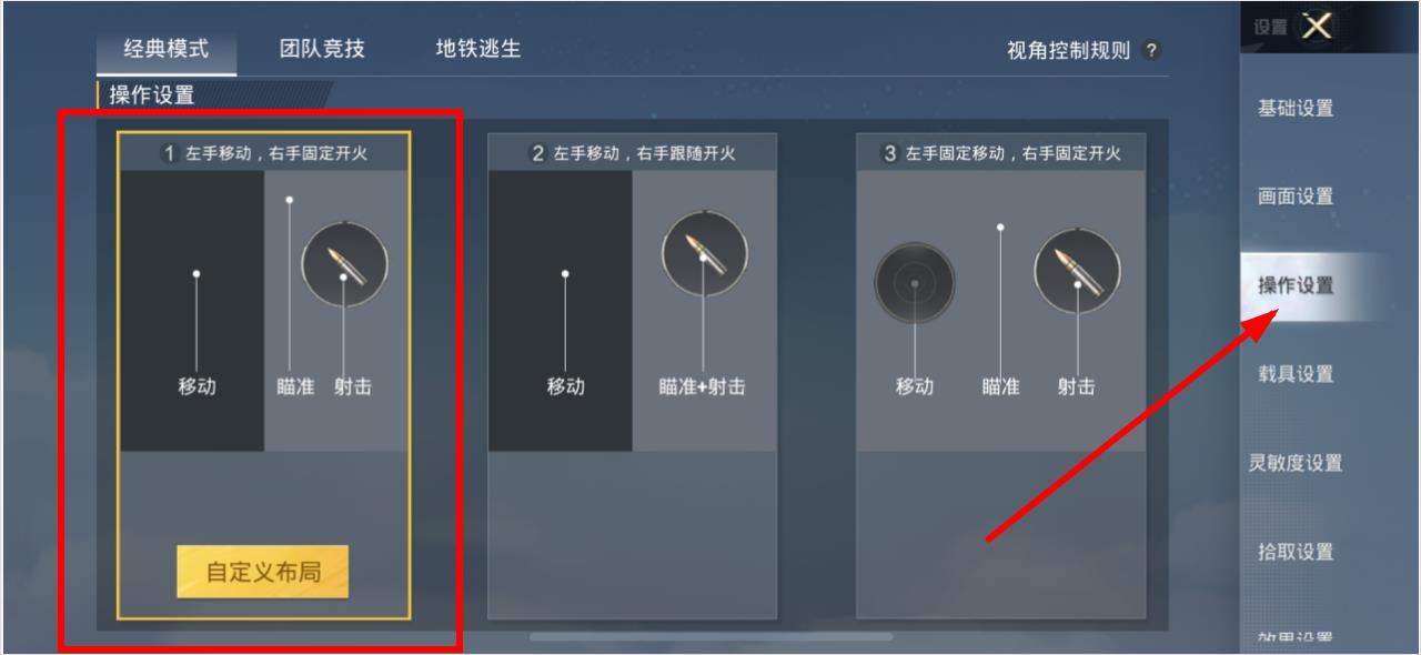 3、在操作設(shè)置界面,選擇一種操作方式如左手移動(dòng),右手固定開(kāi)火,點(diǎn)擊下方的自定義布局,即可對(duì)游戲按鈕布局進(jìn)行調(diào)整,完成后點(diǎn)擊保存。
