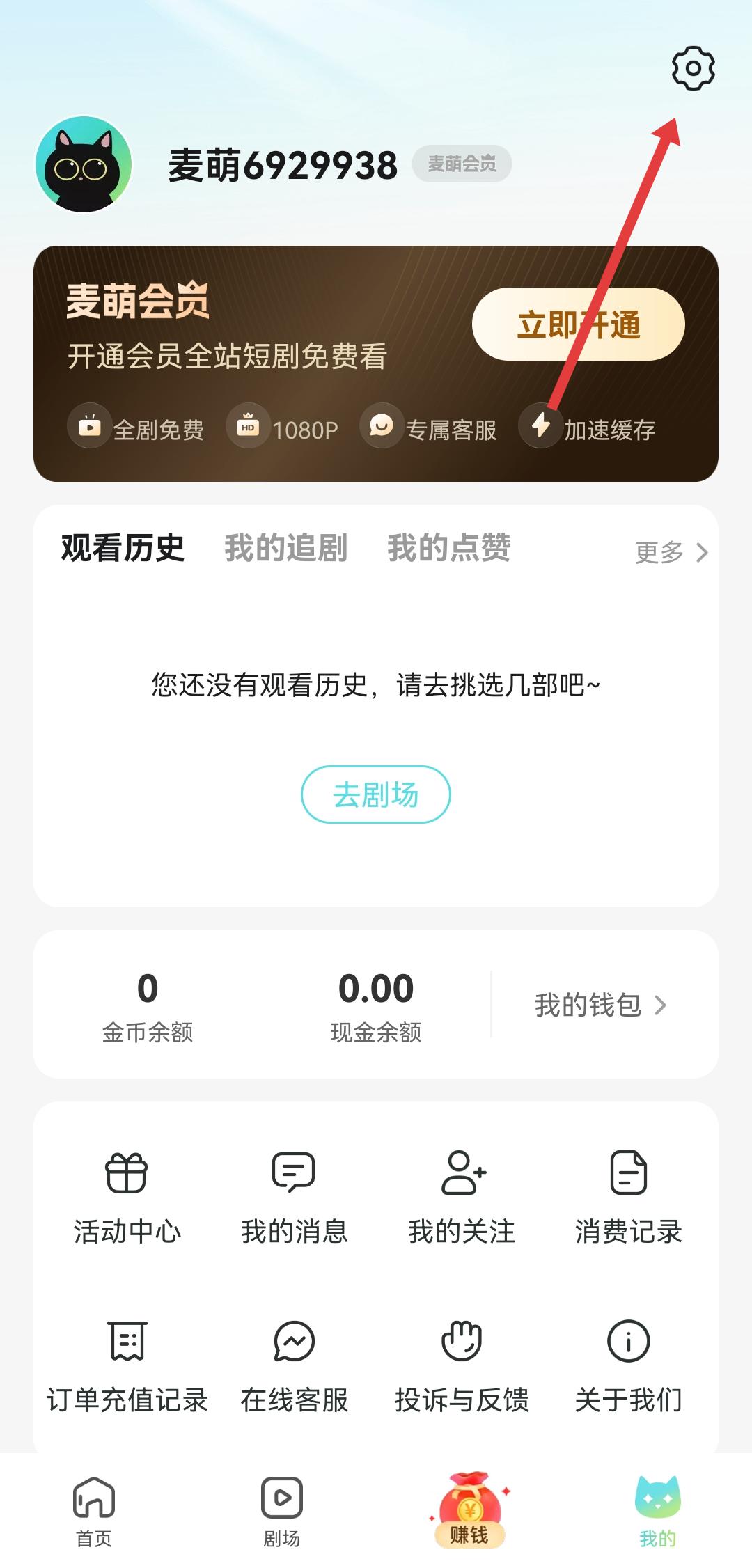 1、打開麥萌短劇APP,進(jìn)入我的頁面,點(diǎn)擊右上角的設(shè)置圖標(biāo),進(jìn)入設(shè)置界面。