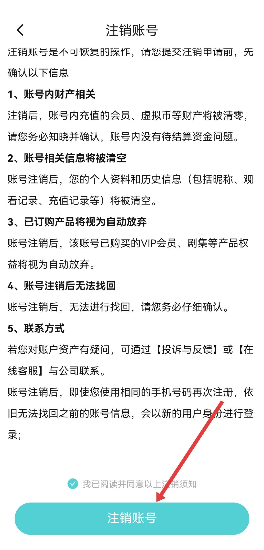 3、在注銷賬號(hào)說明頁面,仔細(xì)閱讀注銷須知后,勾選注銷須知,然后點(diǎn)擊注銷賬號(hào)按鈕。