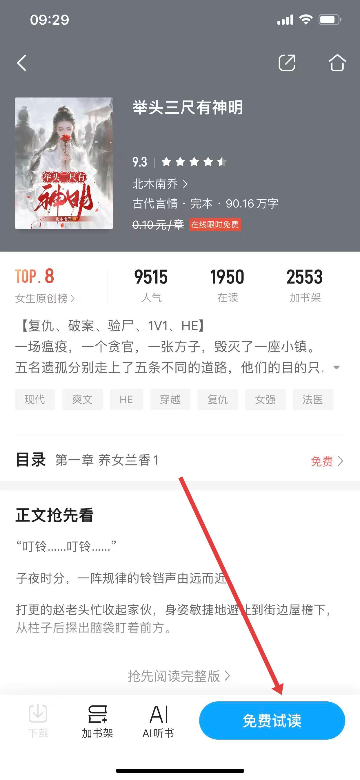 2、在書籍詳情頁面,點擊免費試讀選項,進入閱讀界面。