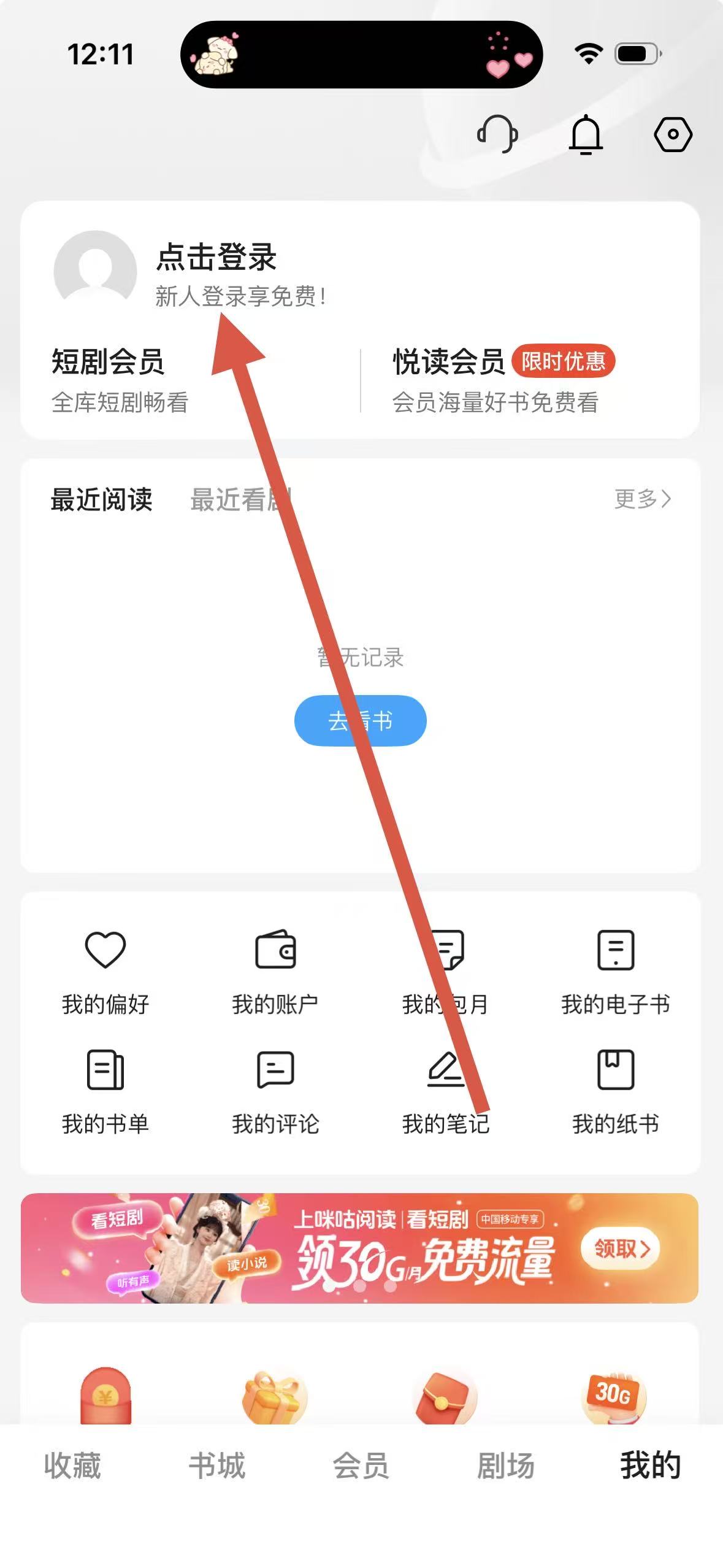 1、打開咪咕閱讀APP,在首頁點擊下方我的選項,進入個人界面。