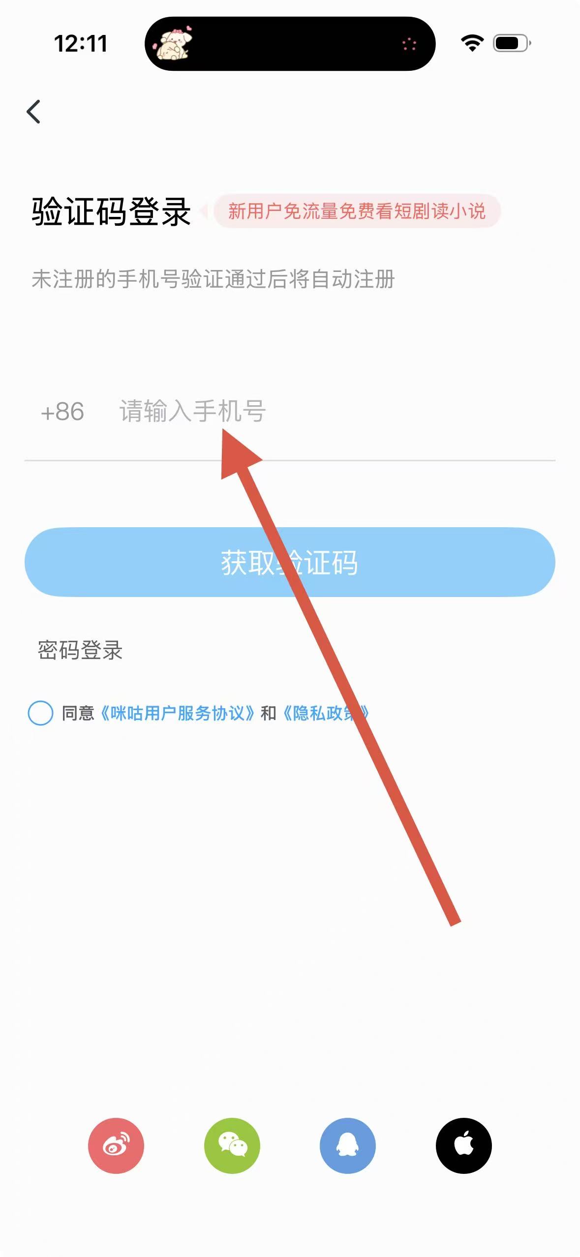 3、在登錄頁面選擇驗證碼登錄,并在手機號輸入框中輸入手機號。