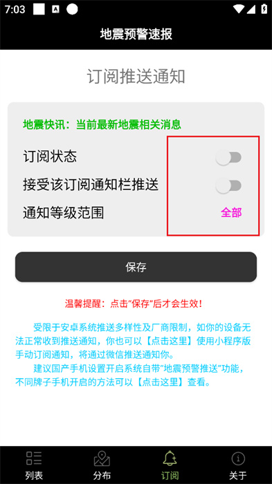 3、緊接著,切換到【訂閱】頁面,將這里的開關(guān)開啟,可以第一時間收到地震的最新資訊;